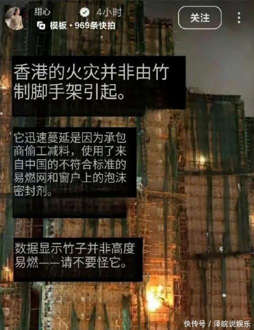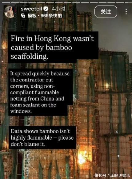 01这件事的起点,是汪诗诗在ins转发的一段英文内容。里面写着香港火灾蔓延得这么快,是因为“承包商偷工减料,用了来自中国的非阻燃材料”。还强调“竹脚手架不是问题,问题是中国材料”。这段内容的表达方式非常明确,让人直接理解成“火灾怪内地”。而当时官方调查还没公布结论,她却提前下判断,还把矛头指向供应地。敏感时期,这种表述很容易让人上头。截图传到微博后,不少网友第一反应是困惑,再一路升级到愤怒。因为她把责任推到“来自中国”,容易让人感到被划分界限。尤其在灾后各方正忙着支援,她的表达显得格格不入。舆论刚起势,她就删了内容。但删帖不是消失,截图已经成了传播链条的一部分。这一步操作,让道歉变成了必选项。