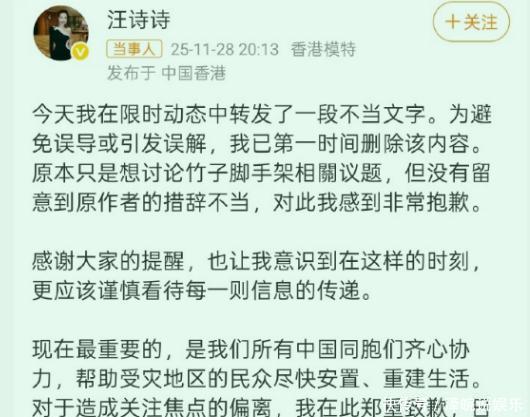 这件事,看似只是一次冲动转发,却牵动太多情绪。一端是灾后敏感的集体痛感,一端是公众人物的言论责任。互联网的速度太快,一条限时动态早已超过“个人随手分享”的范围。公众人物没有“发错了就删”的轻松感,这就是角色带来的分量。表达可以有立场,但表达必须建立在事实与同理上。尤其在悲伤时刻,更要克制,不让自己的声音偏离人性最基本的温度。